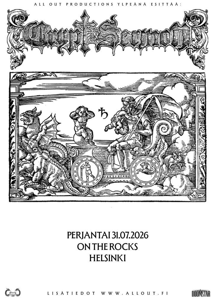 All Out Productions proudly presents: Epic doom metal titans Crypt Sermon are finally coming to Finland! Expect massive riffs, epic melodies, and a crushing wall of doom as Crypt Sermon brings their powerful live performance to Finland for the first time.
